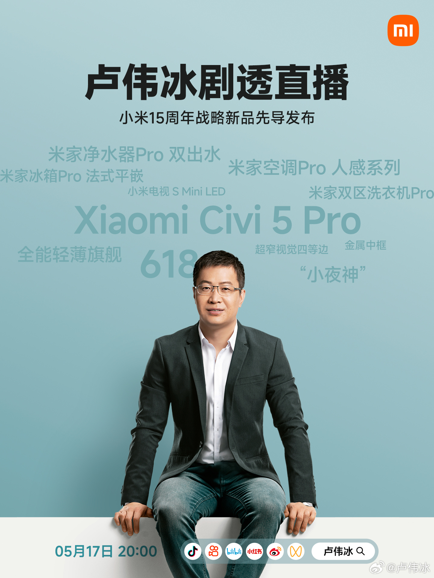 IT之家 5 月 16 日消息,小米集团合伙人、总裁,手机部总裁,小米品牌总经理卢伟冰今日发文宣布,决定开一场小米 15 周年战略新品先导发布直播,“剧透”即将发布的重磅新品。