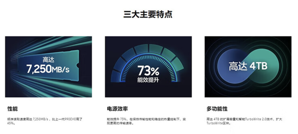 据介绍,这款固态硬盘整体尺寸 80.15 x 22.15 x 2.38mm,采用 PCle4.0 x4/5.0x2 接口,其支持 TurboWrite2.0 智能技术,随机写入 1350K IOPS,其顺序读取写入速度信息如下: