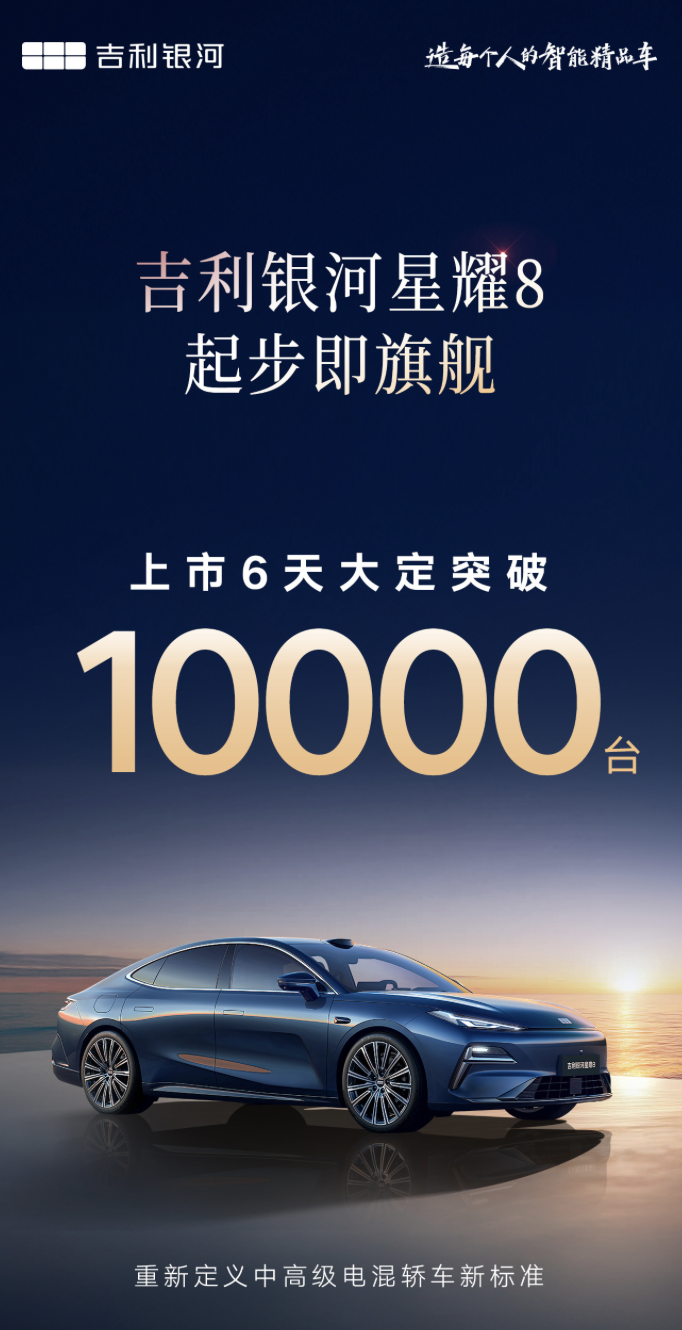IT之家 5 月 16 日消息,吉利旗下银河星耀 8 轿车于 5 月 9 日正式上市,目前吉利宣布该车上市 6 天“大定破万台”。