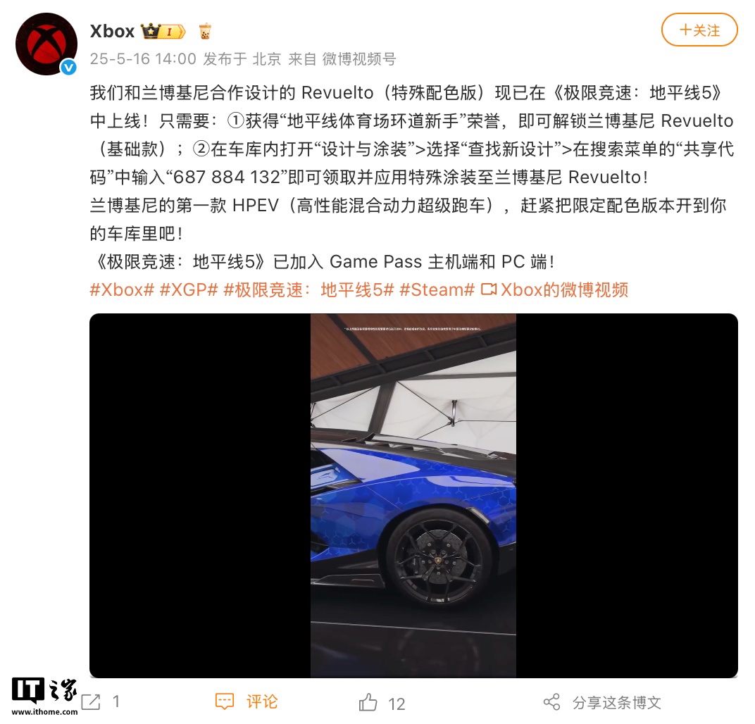 IT之家 5 月 16 日消息,据微软 Xbox 官方微博,微软与兰博基尼合作,为《极限竞速:地平线 5》中的兰博基尼 Revuelto 车型上架一款限定特殊涂装,用户只需获得“地平线体育场环道新手”荣誉,即可解锁相应车型并应用涂装。