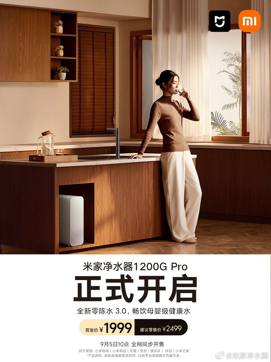 小米米家净水器 1200G Pro 发布于 2024 年 9 月 5 日,其主打 1200G 超快出水、触控定量取水、双芯精滤等特性,建议零售价 2499 元,首发价 1999 元。