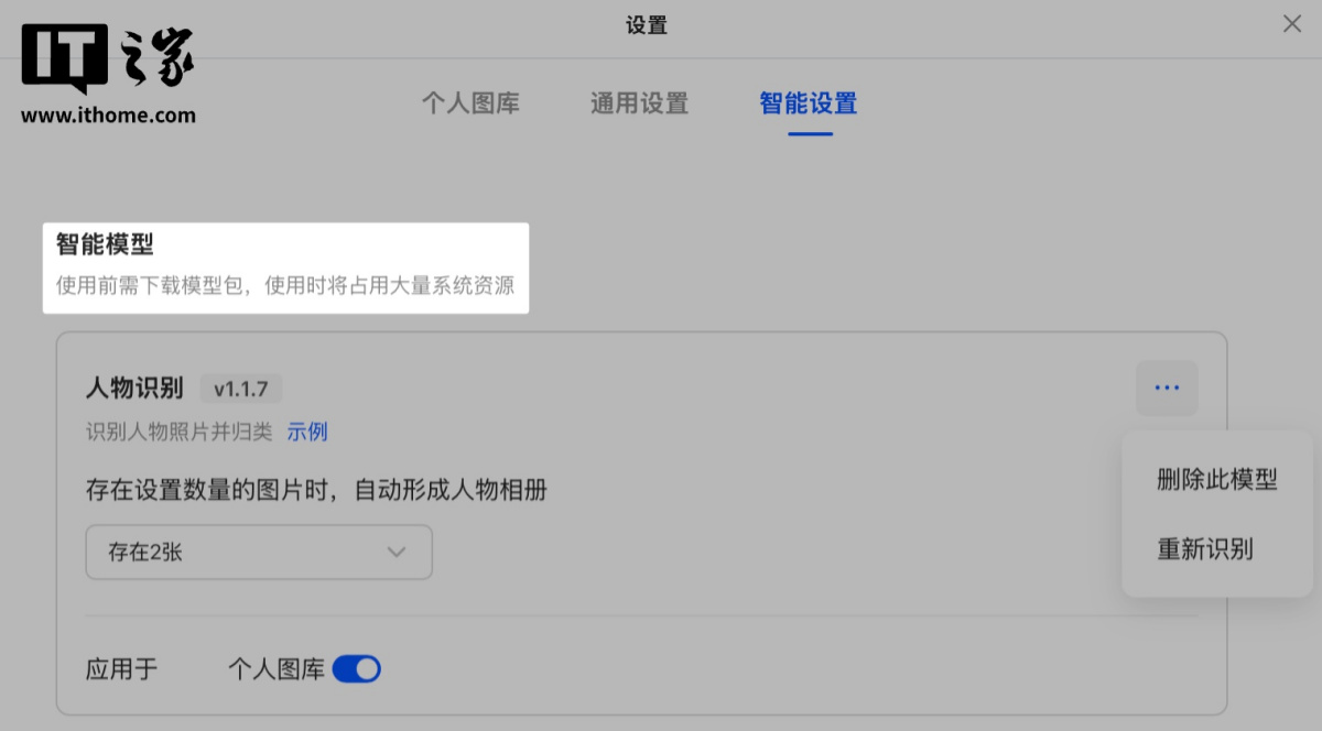 比如其中的“人物识别”模型,开启后可以设置为存在一定张数的人物照片时,自动形成人物相册。