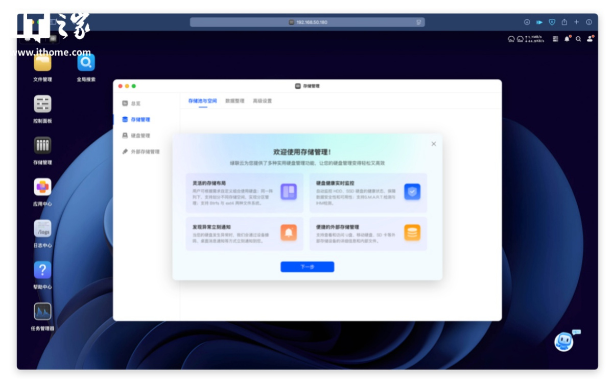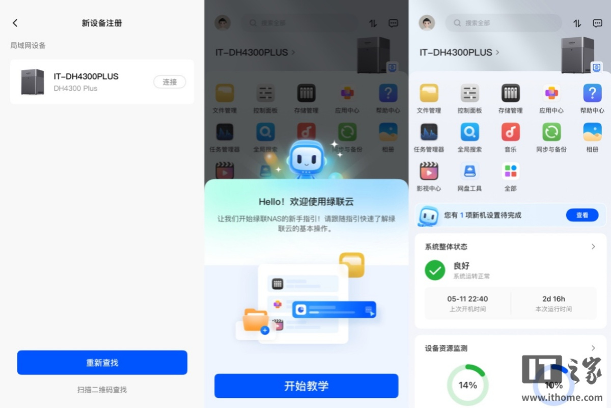 作为一款面向入门用户的设备,简单易用的上手体验还是很关键的。在这方面,绿联 NAS 私有云 DH4300 Plus 和其搭载的 UGOS Pro 系统带来的初次部署体验还是不错的。在使用包装附带的配件安装好硬盘后,就可以通电开机了。