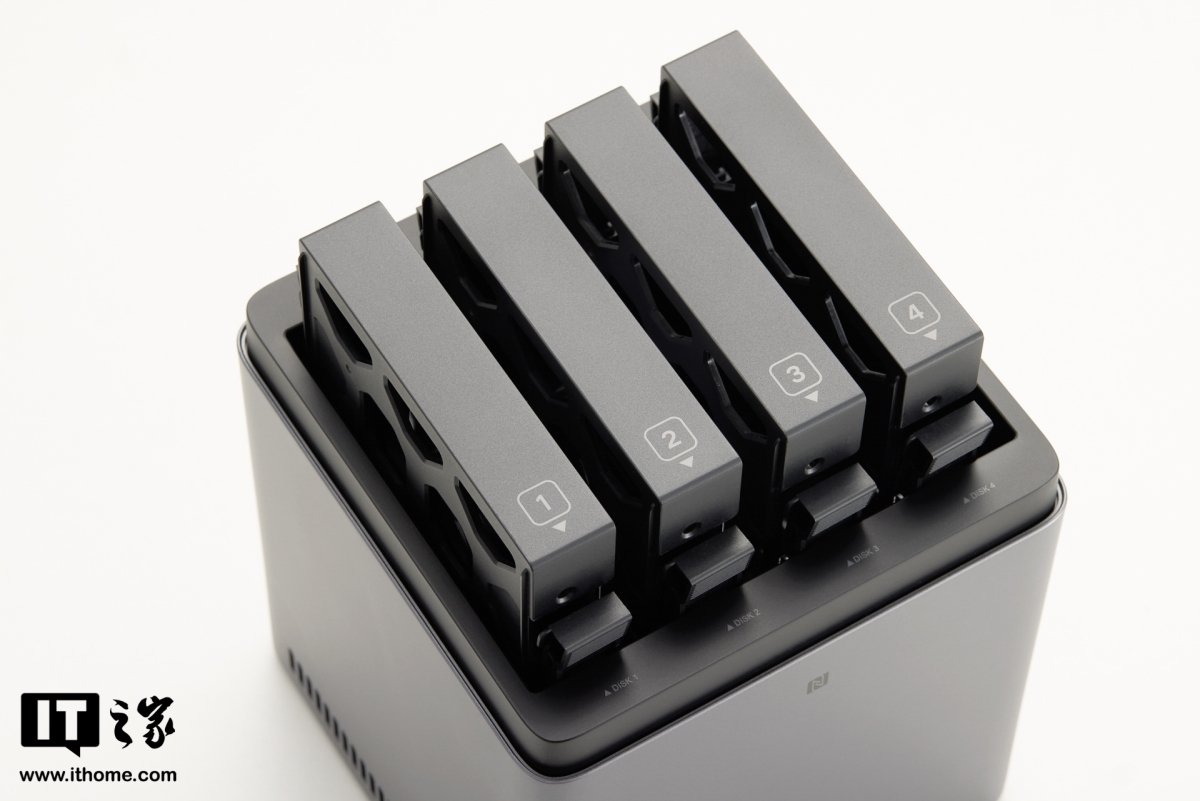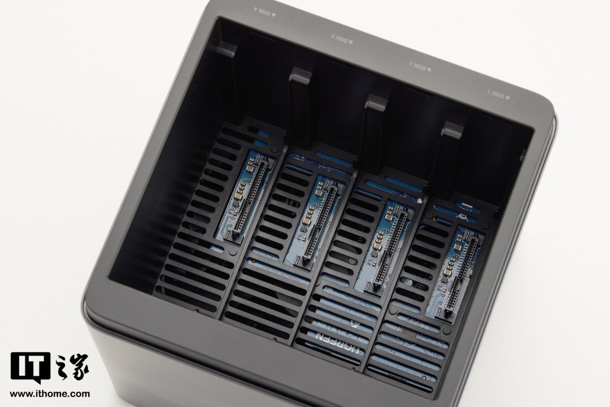 上盖采用磁吸设计,取下后映入眼帘的就是四个硬盘位了。