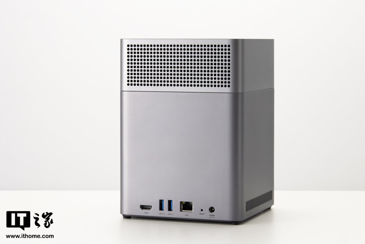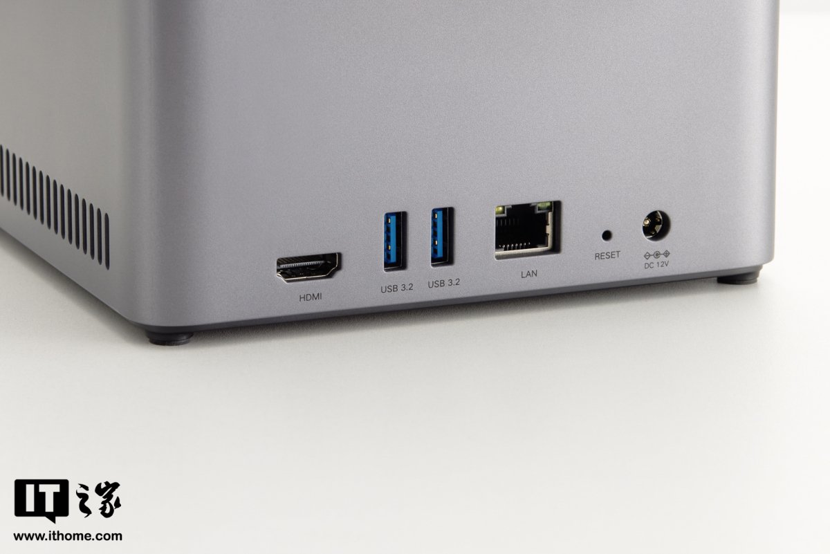 机身背面为 12V6A 电源接口、重置按键、2.5GbE 网口、2 个 USB 3.2 Gen 1 接口和 1 个 HDMI 接口。背面顶部为进风口。