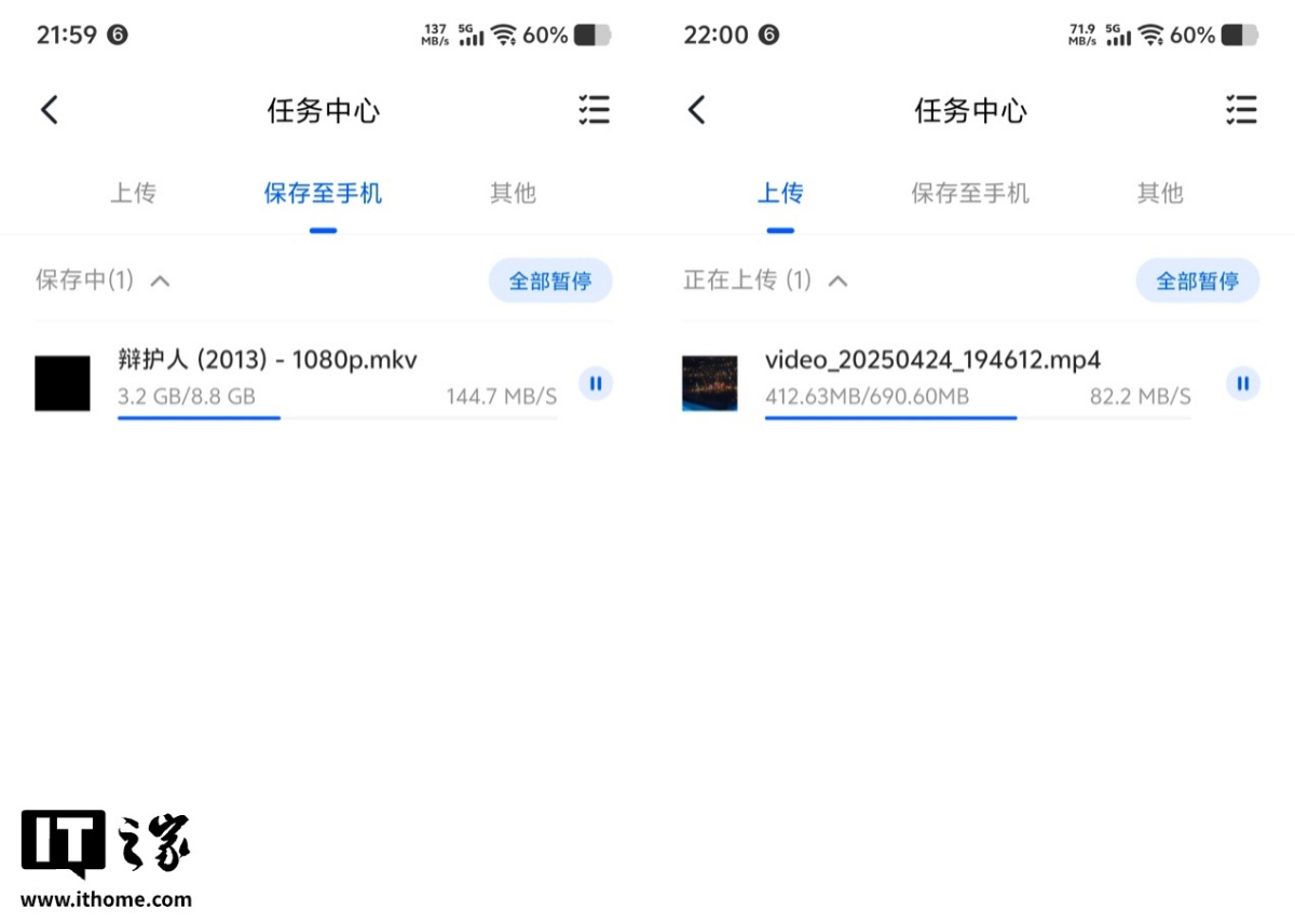 在使用手机通过 WiFi 向本地保存文件时,iPhone 能够实现 110MB/s 左右的下载速度和 50MB/s 左右的上传速度。相比之下,安卓手机在传输时更快,可以实现约 150MB/s 的下载速度和 80MB/s 左右的上传速度。