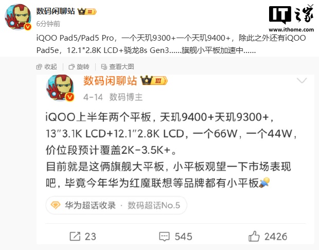 iQOO Pad5 系列平板将于 5 月 20 日 19:00 发布,其中 Pro 版已经确认搭载 40600mm² 立体散热系统、12050mAh 电池、13 英寸大屏,至高 1200nit 亮度,全系搭载 PC 级 WPS 和定制 CAJViewer。