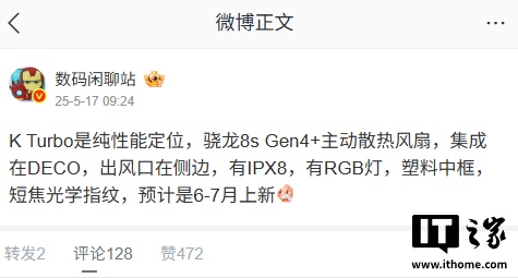 他表示,这款新机属于是纯性能定位,采用第四代骁龙 8s 平台,搭载主动散热风扇,还支持 IPX8 防水,并配备了 RGB 灯、塑料中框、短焦光学指纹等。