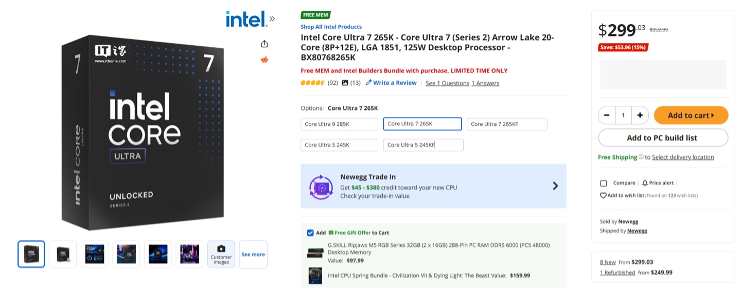 Videocardz 发现,英特尔即日起开始为购买酷睿 Ultra 7 265K 的用户附赠 91.99 美元(现汇率约合 663 元人民币)的 32GB 芝奇幻锋戟 DDR5-6000 内存(IT之家注:京东自营店同款 838 元)。