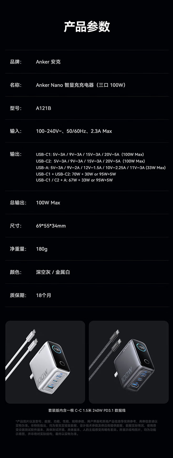 这款 100W 充电头提供灰银双色可选,支持 MiPPS、PPS、PD 3.0、QC、UFCS 协议,正面提供了一块面板,可以实时显示输出功率、温度和充电头通电时间。