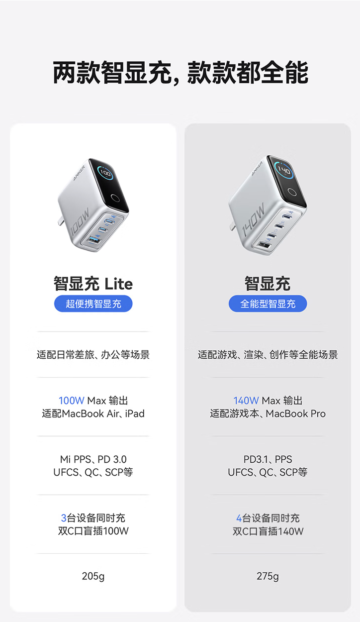 IT之家 5 月 17 日消息,安克现已在京东上架一款智显充 Lite 100W 充电头,采用“2C + 1A”配置,可以看作是之前的 140W 版本调整为 100W 功率,取消了一个 USB-C 接口,改为 PD 3.0 协议,同时新增支持 90W 小米澎湃秒充(Mi PPS),定价为 249 元。