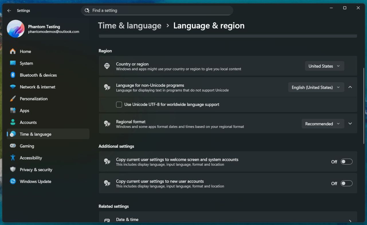 IT之家援引博文介绍,微软在 Dev 和 Beta 频道 Windows 11 预览版中,将“非 Unicode 程序的语言设置”和“将当前用户设置复制到欢迎界面及系统账户 / 新用户账户”两个选项迁移到“时间与语言”下的“语言与地区”栏目中。