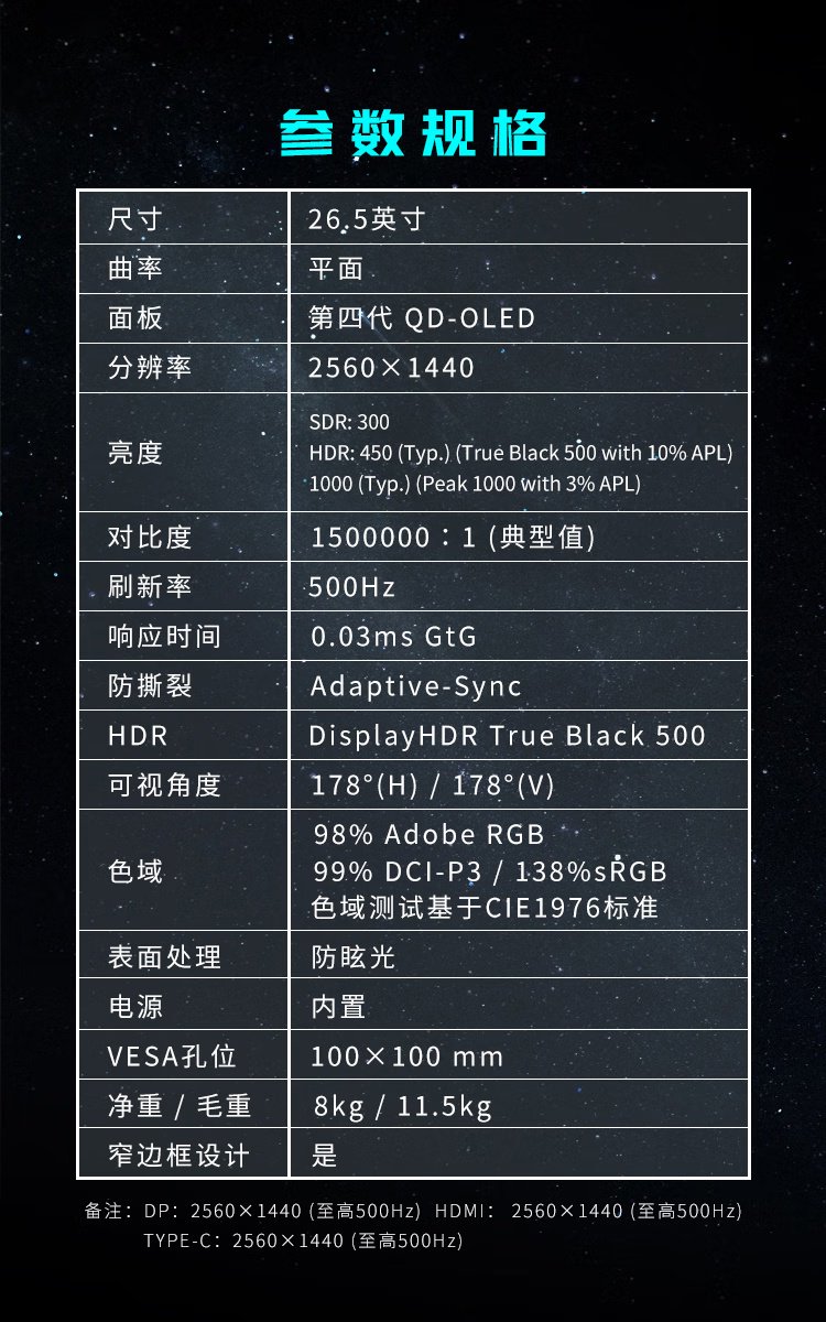 新品采用了 26.5 英寸第四代三星 QD-OLED 面板,具备 WQHD(2560 x 1440)分辨率、500Hz 刷新率和 0.03ms GTG 响应时间,CMR(动态清晰度)值可达 21000,通过德国莱茵认证。