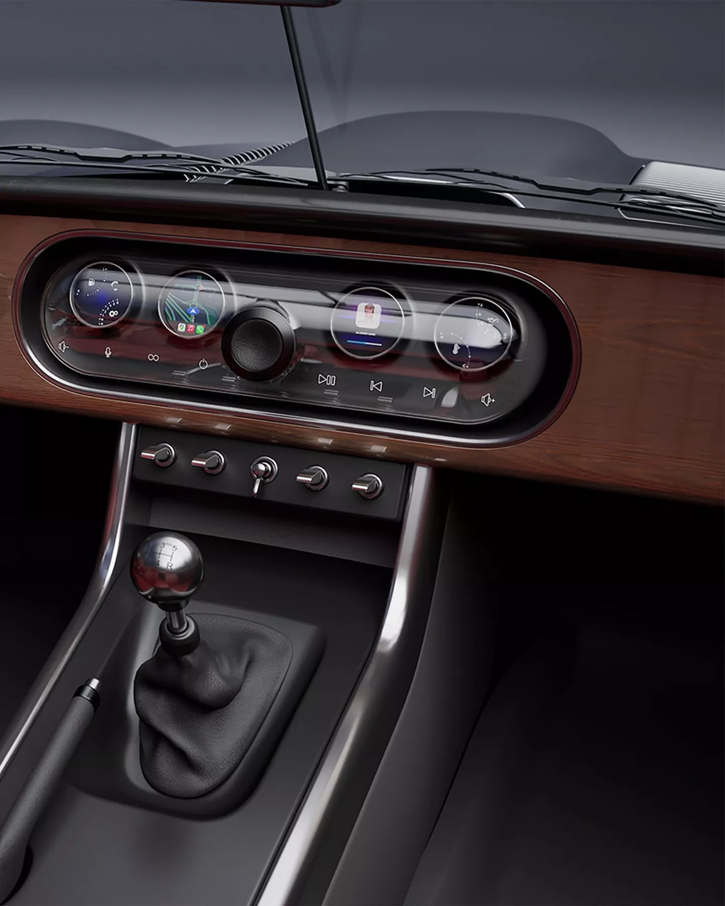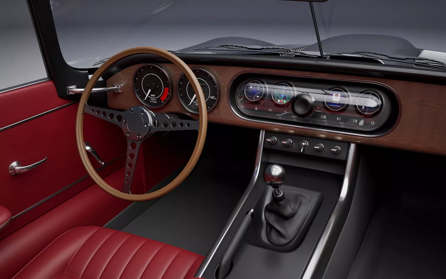 车内将复古风格与现代科技巧妙融合。透明的中央模块内嵌数字仪表和触控媒体系统,而传统的模拟仪表和开关设计依然保留。座椅采用红色皮革,与可收起的布顶相得益彰。车内还配备了木质方向盘、手动换挡杆和精致的铝制装饰。