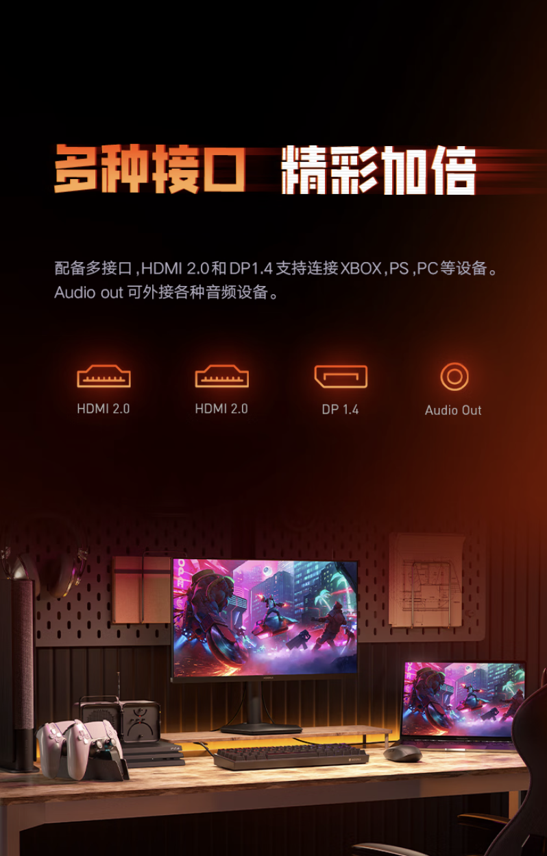 这款显示器支架支持俯仰,显示器本体支持 VESA 100x100mm 壁挂,提供 2 个 HDMI 2.0、1 个 DP 1.4、1 个 3.5mm 音频接口。