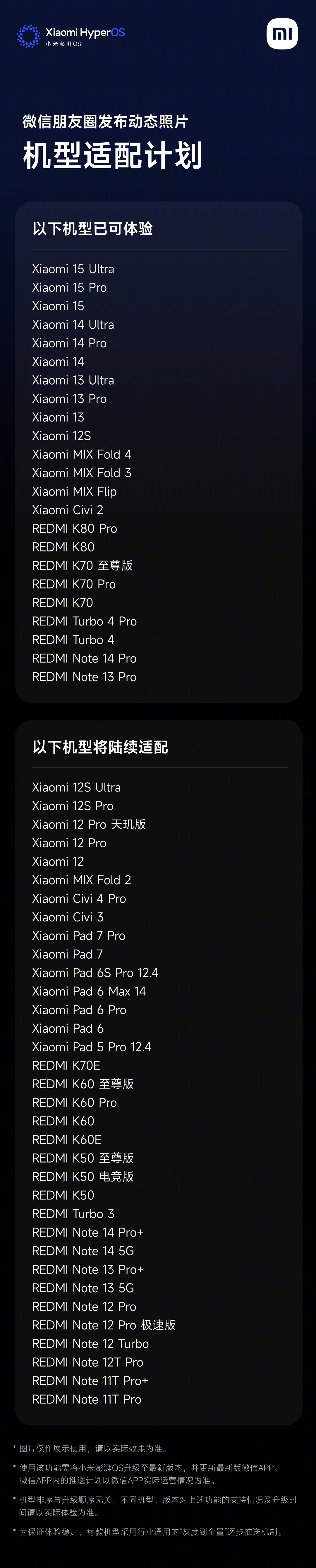 IT之家注意到,小米澎湃 OS“微信朋友圈发布实况照片”机型适配计划于上个月公布,含 REDMI Turbo 4 等超二十款机型。