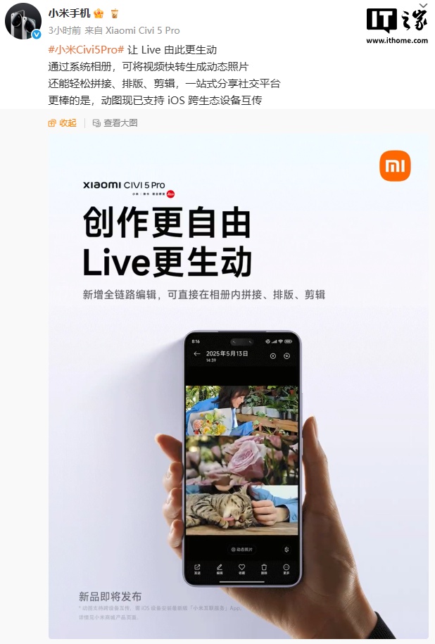 官方海报显示,小米 Civi 5 Pro 新增 Live 图全链路编辑,可直接在相册内拼接、排版、剪辑。现已支持 iOS 跨生态设备互传,一站式分享社交平台。