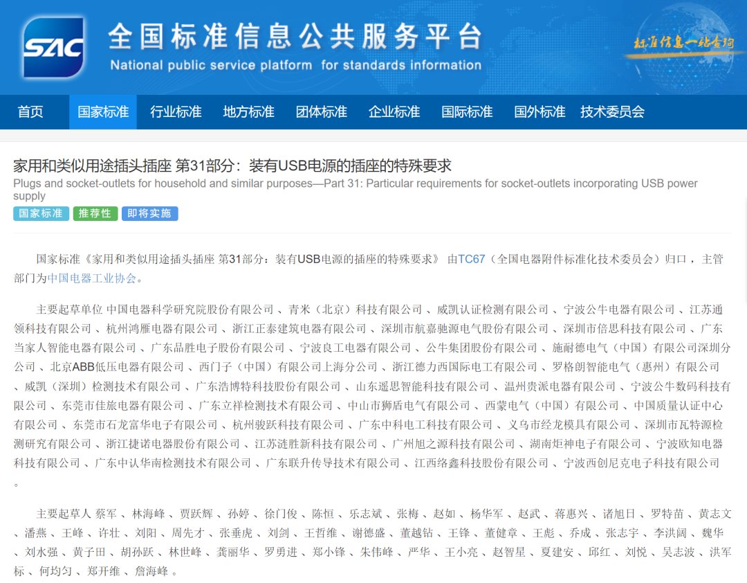 IT之家附 GB / T 2099.31-2025《关于家用和类似用途插头插座 第 31 部分:装有 USB 电源的插座的特殊要求的标准》主要起草单位如下: