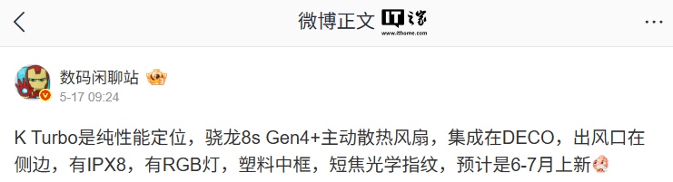 据IT之家昨日报道,有爆料称 OPPO K 系列 Turbo 新机预计将于 6-7 月发布(有望命名为 OPPO K13 Turbo / Pro)。这款新机属于是纯性能定位,采用第四代骁龙 8s 平台,搭载主动散热风扇,还支持 IPX8 防水,并配备了 RGB 灯、塑料中框、短焦光学指纹等。