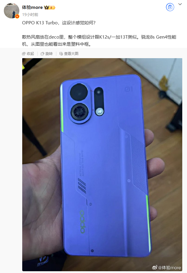 IT之家 5 月 18 日消息,据博主 @体验more 分享,OPPO K13 Turbo 手机将采用机甲元素后盖设计、配备主动散热风扇(散热风扇放在 Deco 里),整个模组设计跟 K12s / 一加 13T 类似。