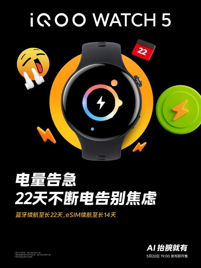 IT之家 5 月 18 日消息,iQOO WATCH 5 智能手表将于 5 月 20 日 19:00 发布并开售,最新预热显示,这款新品蓝牙续航至长 22 天,eSIM 续航至长 14 天。