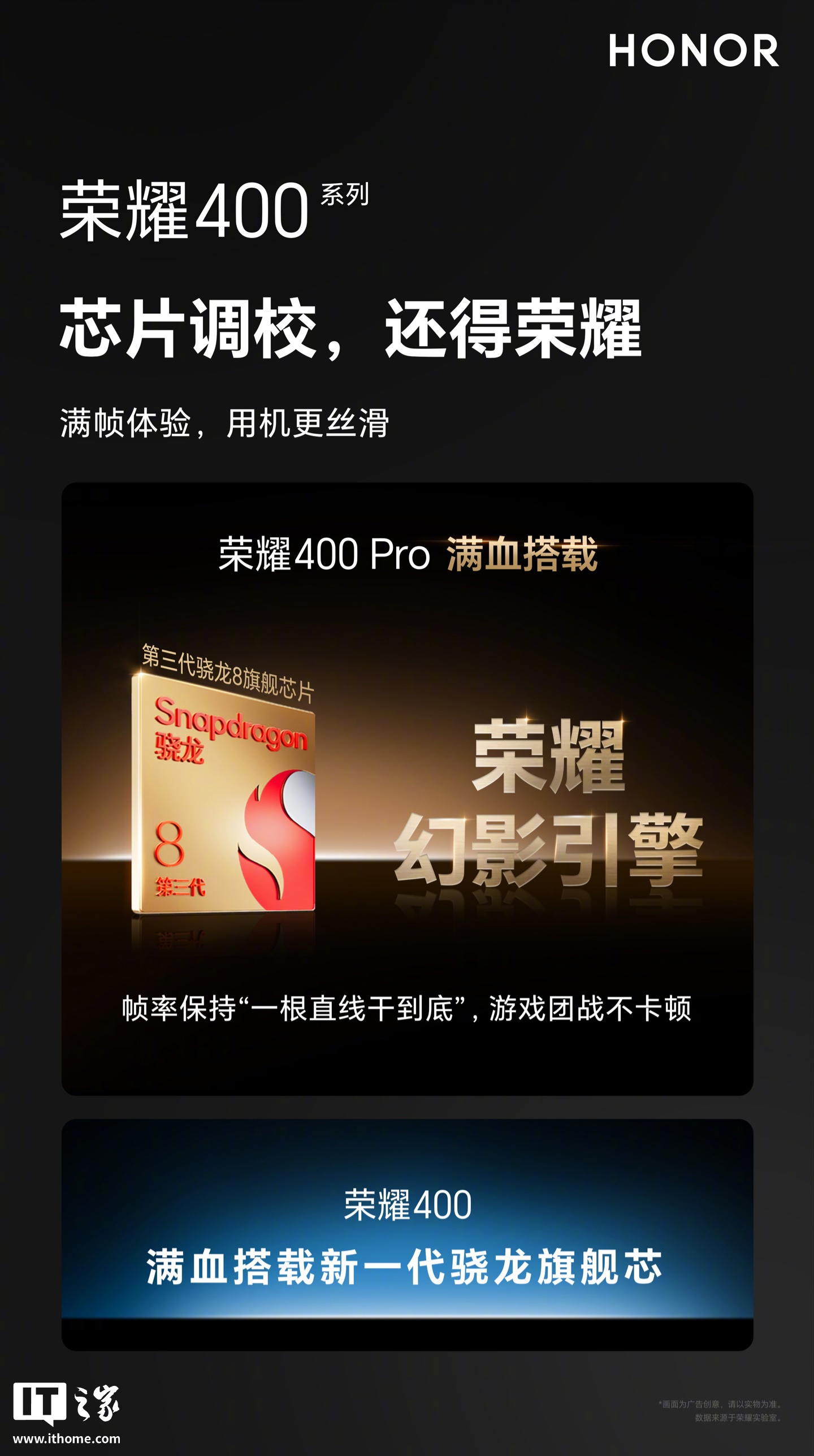 根据荣耀官方预热,荣耀 400 系列手机全系性能升级,其中 Pro 机型确定搭载第三代骁龙 8 旗舰芯片,内置荣耀自研幻影引擎,号称游戏帧率保持“一根直线干到底”,团战从此无卡顿。另外,标准版首发高通骁龙 7 Gen4 处理器。
