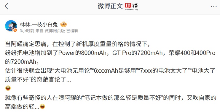 IT之家注意到,荣耀中国区副总裁、智慧生活业务部部长林林今日发文透露,荣耀 400 和荣耀 400 Pro 手机的电池容量为 7200mAh。