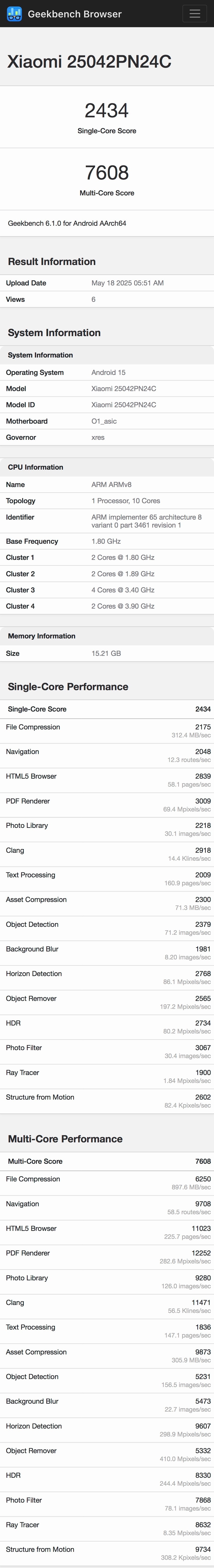 IT之家 5 月 18 日消息,Geekbench 6.1.0 跑分平台今日出现了一款“Xiaomi 25042PN24C”新机的成绩,也就是此前入网的小米新机,支持 UWB 和 90W 快充。