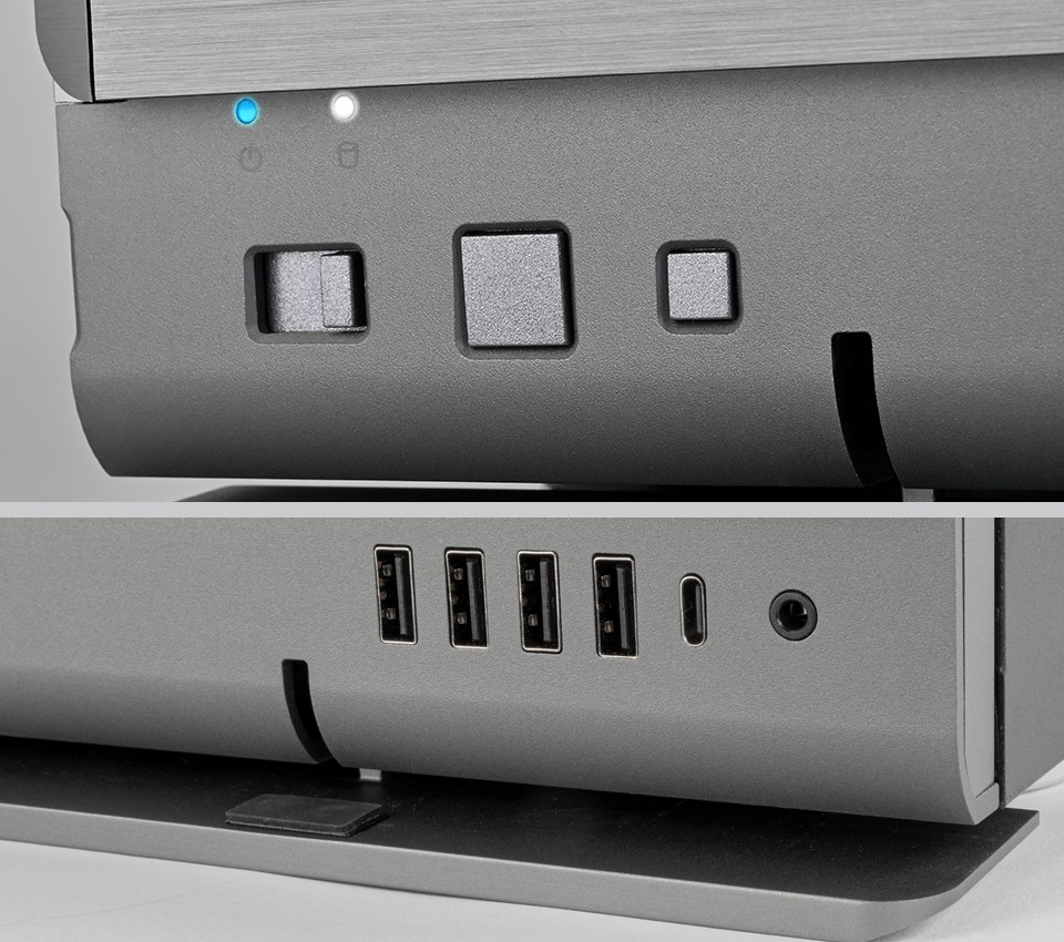 Crown 04 机箱的前置 I/O 面板位于正面下方滑动式盖板的右侧,提供了 1 个 USB-C、4 个 USB-A 5Gbps 和 1 个二合一音频插孔;这一盖板的左侧则包含可调式的 LED 指示灯、开机键等元素。