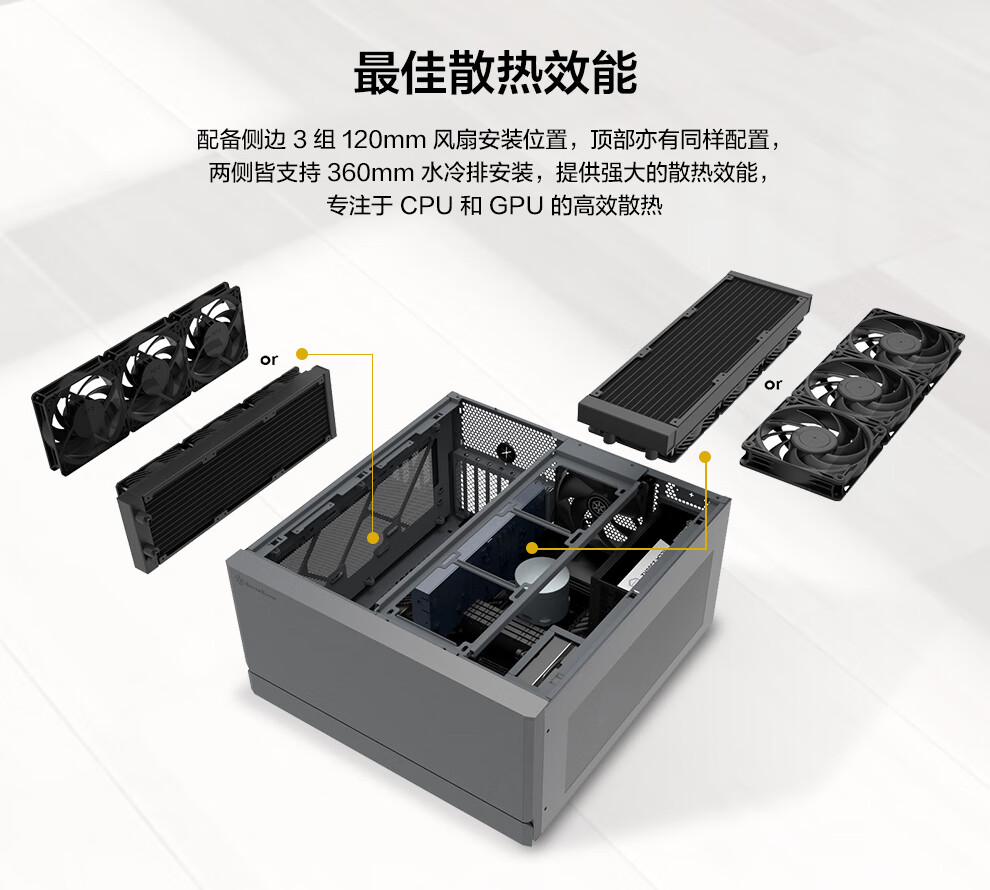 这款机箱可容纳 180mm 高的 CPU 散热器、208mm 长电源(含标准 PS2 / ATX 和 Mini Redundant)、400mm 长显卡。若用户使用随附的显卡固定架,则允许安装 159mm 高显卡;卸下固定架则兼容提升至 198mm。