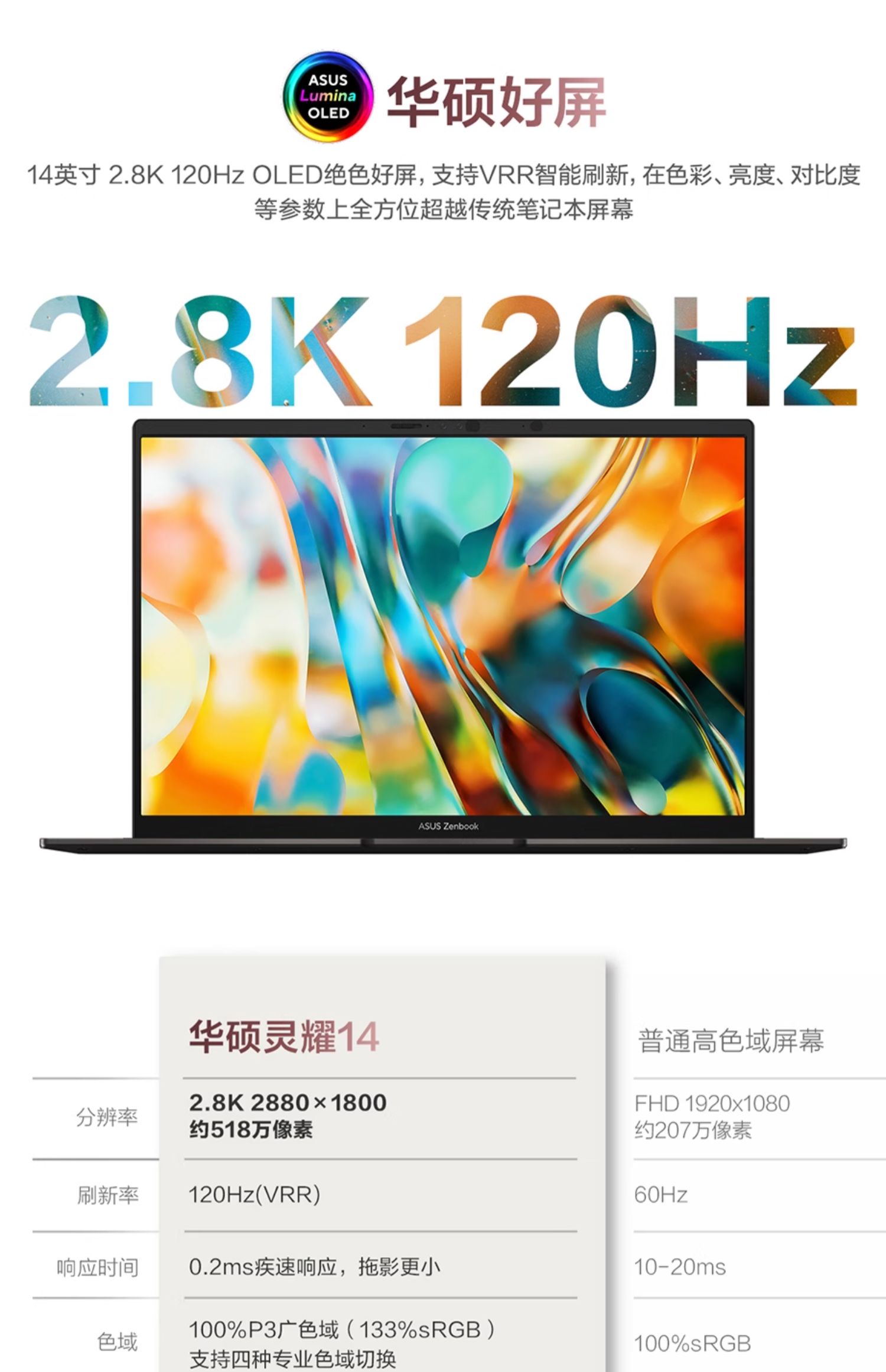 这款机型配备 32GB LPDDR5x 7500 内存和 1TB PCIe SSD(IT之家注:单盘位);采用了 14 英寸 2.8K 120Hz OLED 屏(响应速度 0.2ms、100% DCI-P3 色域、 600 尼特亮度),通过 HDR600 TrueBlack 认证,支持杜比全景声;整体厚度约 13.9 毫米,重量 1.19 千克。