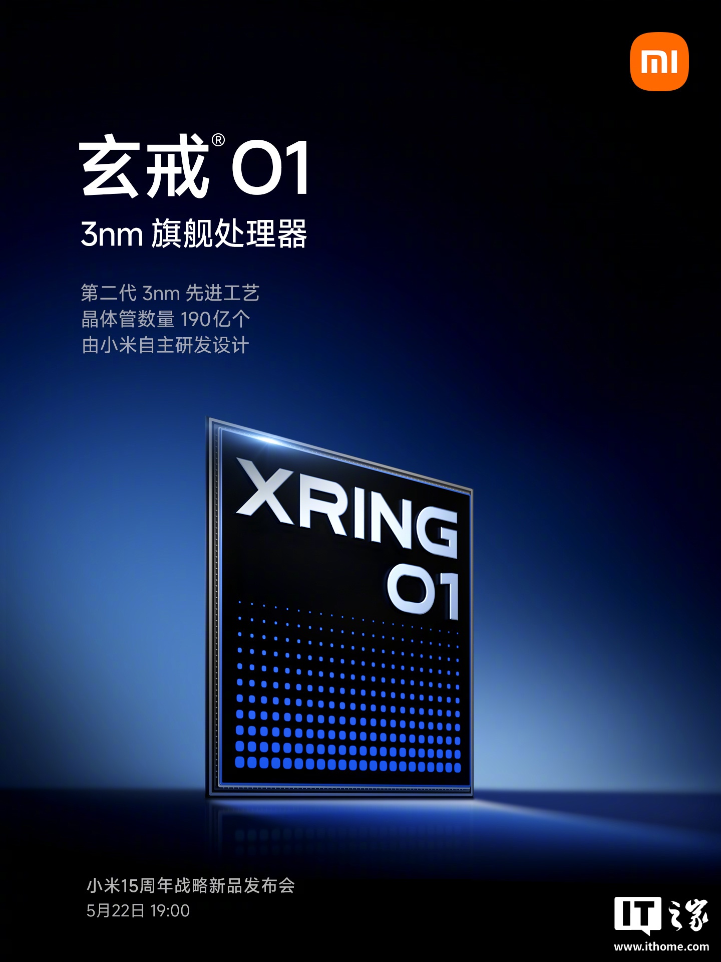 小米 15 周年战略新品发布会定档 5 月 22 日晚 7 点,届时将带来全新手机 SoC 芯片“玄戒 O1”、全新旗舰小米 15S Pro 与小米平板 7 Ultra、全新小米 YU7 SUV 汽车等新品。其中小米自主研发设计全新旗舰处理器「玄戒 O1」历时 4 年研发,采用第二代 3nm 工艺制程,晶体管数量 190 亿个。