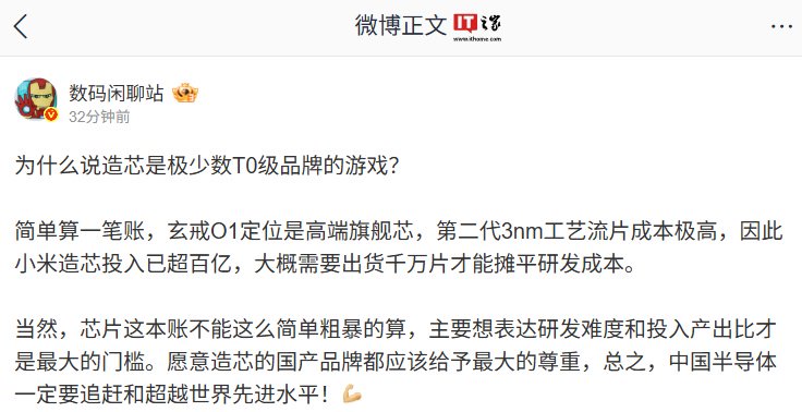 IT之家注意到,博主 @数码闲聊站 今日发文透露,玄戒 O1 定位是高端旗舰芯,第二代 3nm 工艺流片成本极高,因此小米造芯投入已超百亿,大概需要出货千万片才能摊平研发成本。