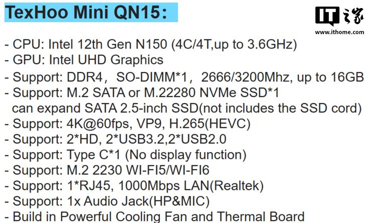 IT之家 5 月 19 日消息,天虹 TexHoo 发布了 QN15 迷你主机,该机主打观影、办公体验,搭载英特尔 N150 处理器。