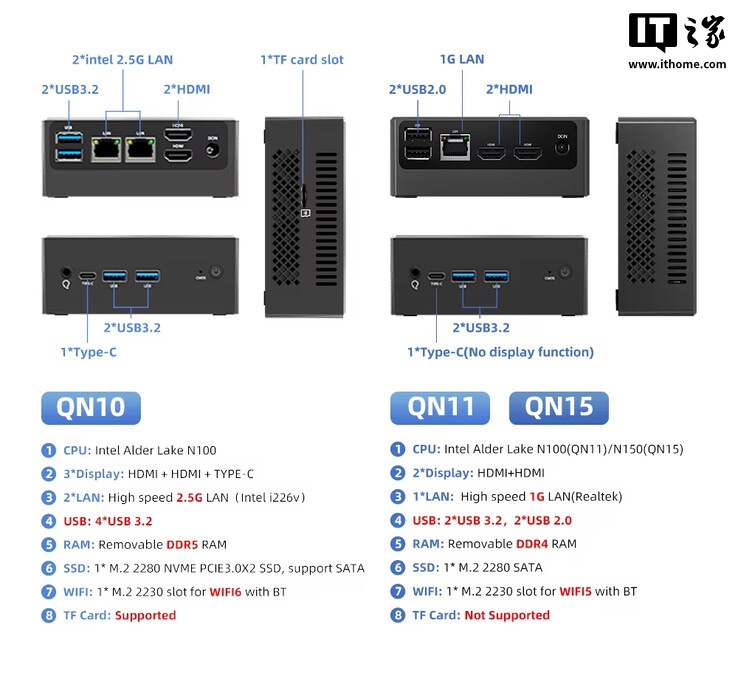 该迷你主机相比 QN10(支持 Wi-Fi 6)在连接性方面有所降级,只支持 Wi-Fi 5;同时该机的 USB-C 接口不支持视频输出,只能通过内置的两个 HDMI 接口进行视频输出。