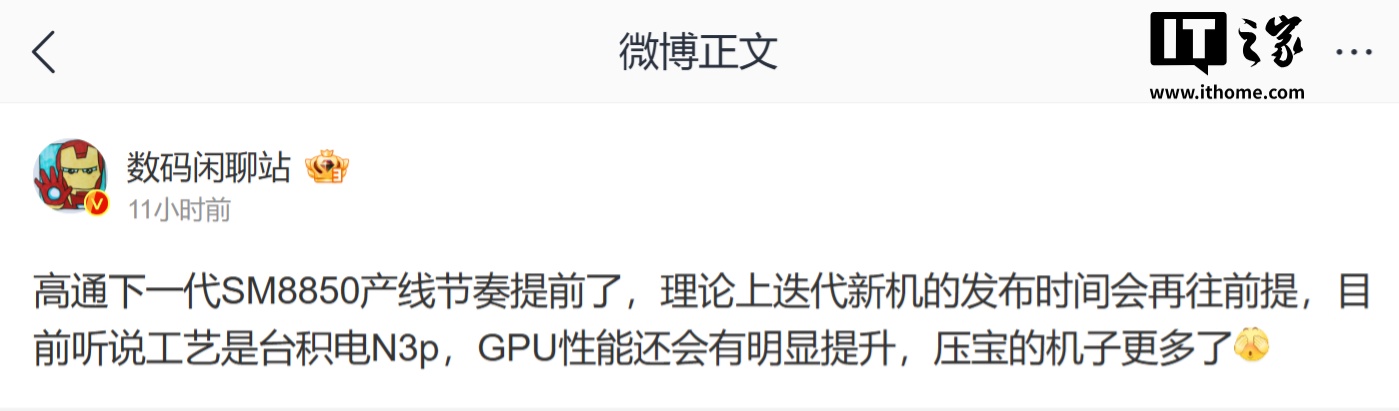 博主 @数码闲聊站 曾透露,高通下一代 SM8850 产线节奏提前,理论上迭代新机的发布时间会再往前提。
