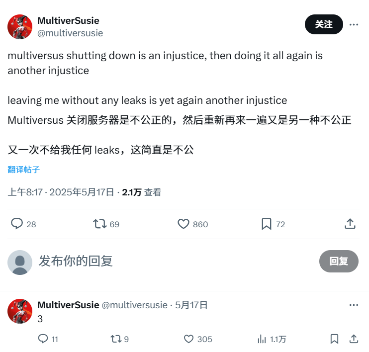 该账号发文称:“《多元宇宙大乱斗》的关停是一种不义,再来一次则是错上加错。”她还表示:“让我无料可爆,又是一种‘不义联盟’。”随后,她回复了一条内容为“3”的帖子,暗示《不义联盟 3》的可能性。