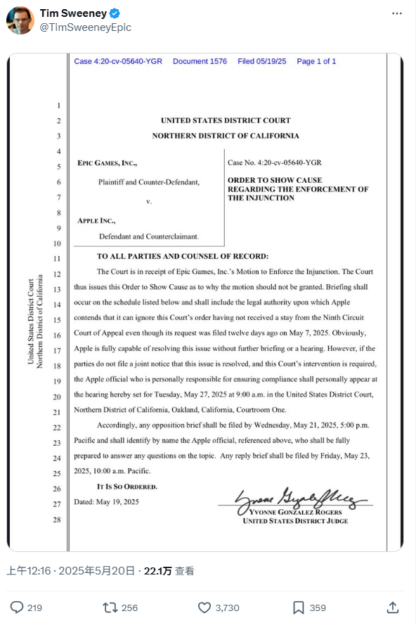 如果苹果继续不批准《堡垒之夜》在美国 App Store 上架,或者说,若是双方未能在 5 月 27 日听证会前达成和解,苹果公司“负责合规事务的高管”须亲自出庭。