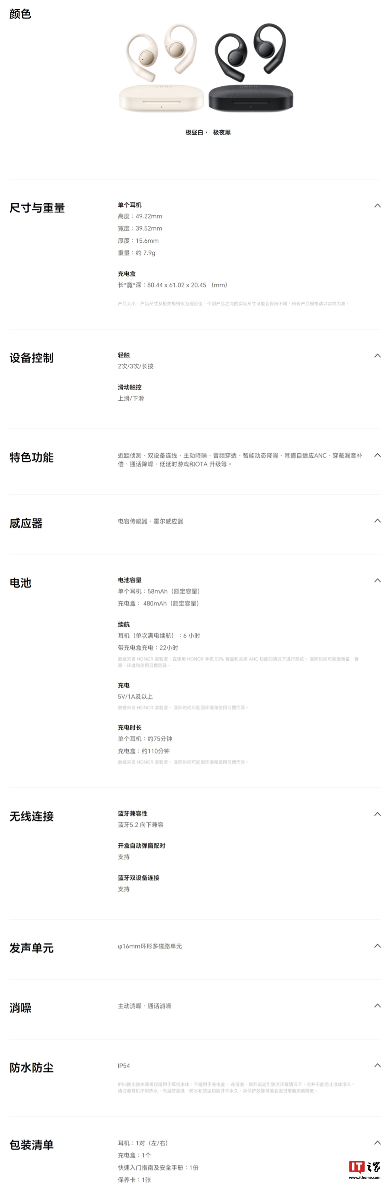 IT之家附荣耀 Earbuds Open 无线耳机相关信息如下: