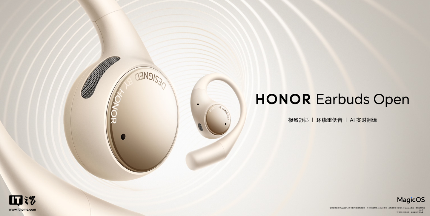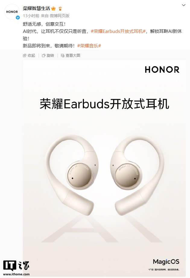 IT之家 5 月 20 日消息,荣耀终端股份有限公司官方微博 @荣耀智慧生活 昨日官宣了一款耳机新品 —— 荣耀 Earbuds 开放式耳机。新品号称“舒适无感”,将于近期发布。