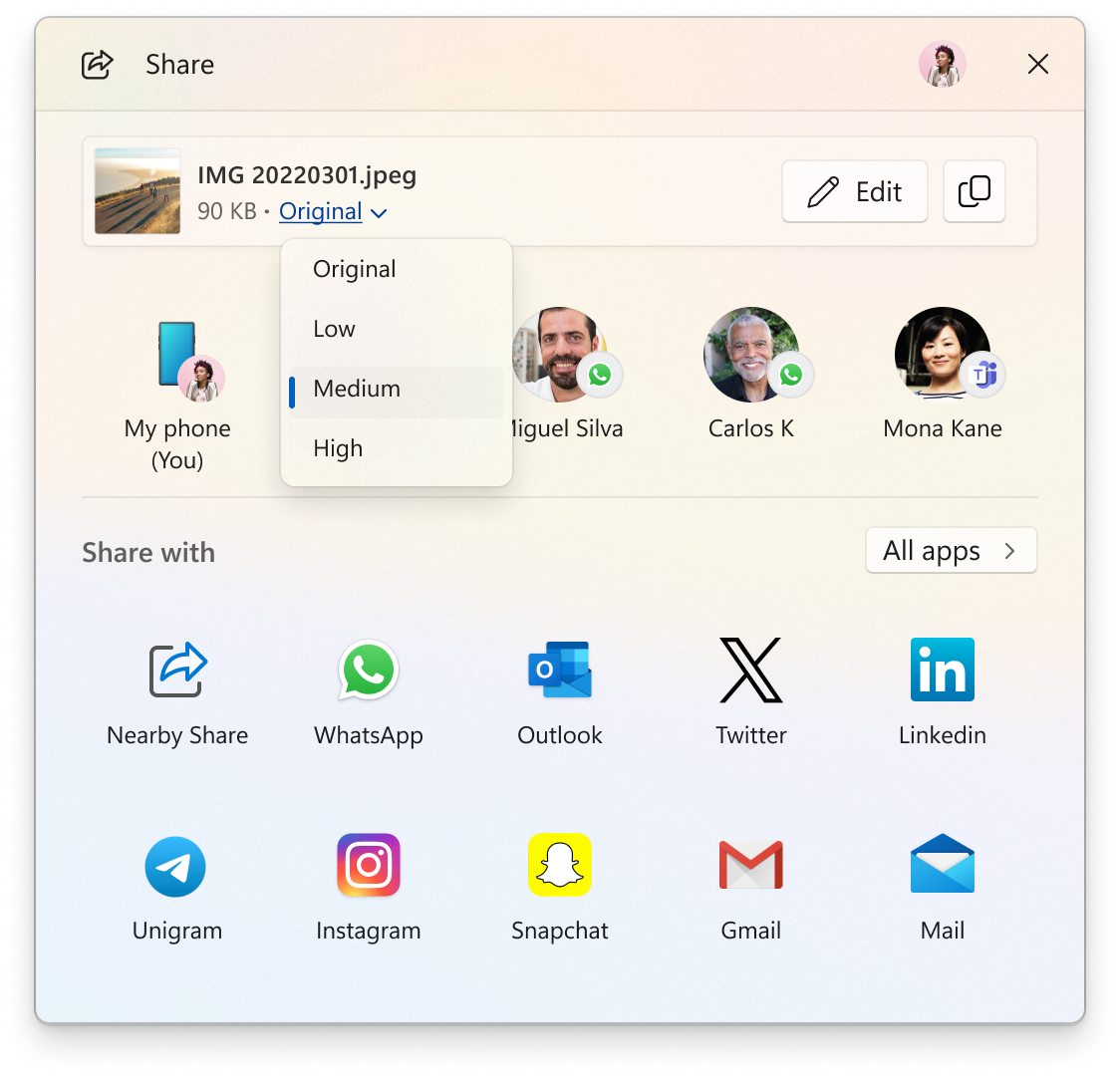 在 Windows 共享窗口中,作为快速编辑和增强图像共享功能的一部分,微软调整了用户界面,现在用户可以从高、中、低三种质量中选择压缩比例,而不再是从 0 到 100 的整个范围中选择。