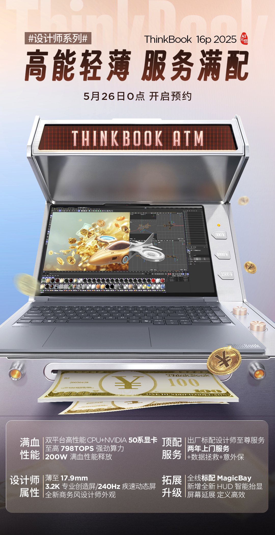 IT之家 5 月 20 日消息,联想 ThinkBook 16p 2025 AI 元启版设计师系列机型宣布将于 5 月 26 日 0 点开启预约,截至IT之家发稿暂未上架。