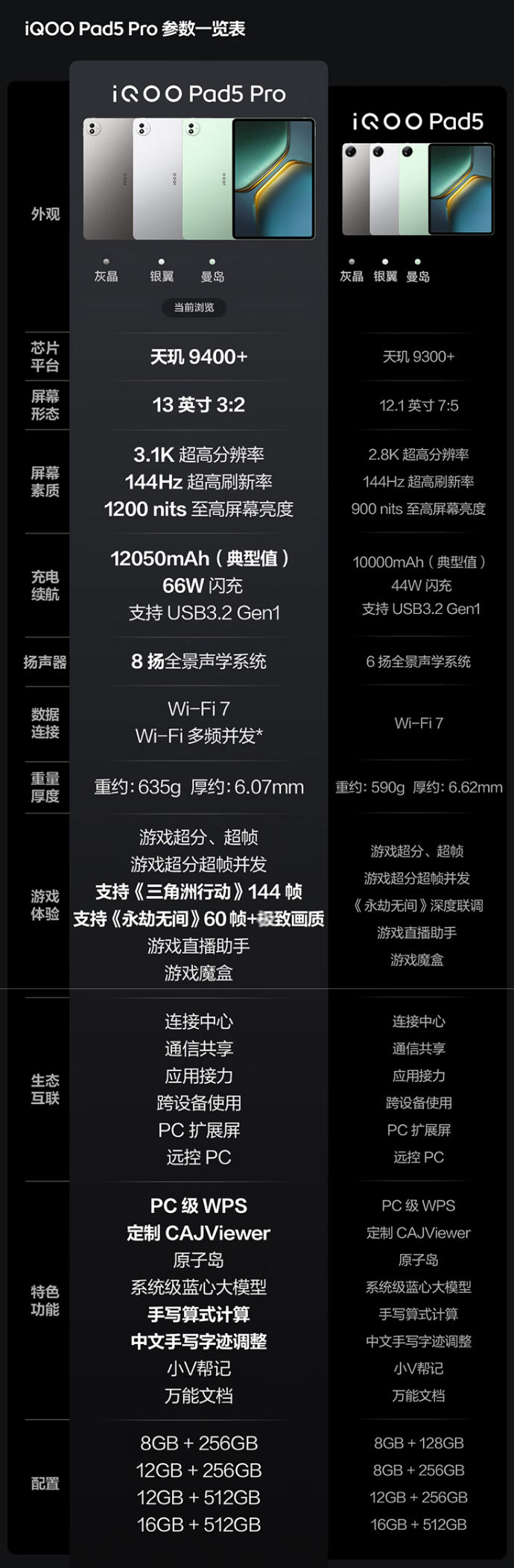 iQOO Pad5 Pro 搭载联发科天玑 9400+ 处理器,配有 13.2 英寸 3.1K 分辨率 144Hz 高刷 1200 尼特屏;拥有 12050mAh 电池,支持 66W 快充。