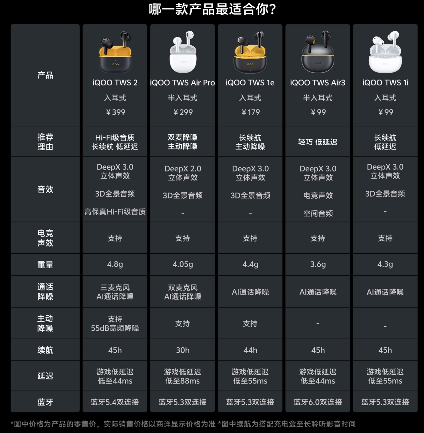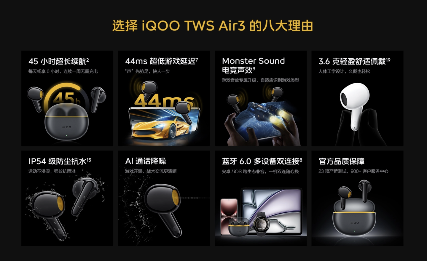 IT之家 5 月 20 日消息,在今天的 iQOO 发布会中,iQOO TWS Air3 耳机正式发布,这款耳机主打 45 小时长续航、44ms 游戏延迟、Monster Sound 电竞音效,定价为 99 元,国补后 84.15 元。