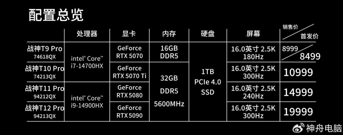 | 战神 T9 Pro | 酷睿 i7-14700HX | RTX 5070 | 16GB DDR5(官方未写频率) | 1TB PCIe 4.0 SSD | 16 英寸 2.5K 180Hz(官方未写精确分辨率) | 8999 元 / 8499 元 |