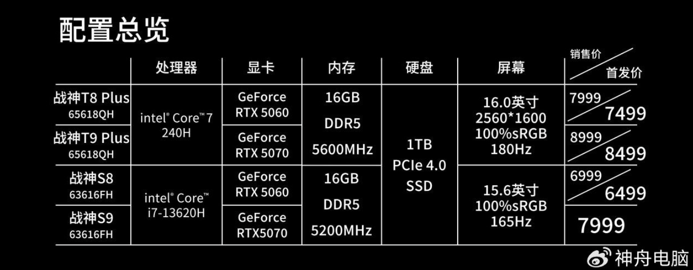 | 战神 T9 Plus | 酷睿 7-240H | RTX 5070 | 16GB DDR5 5600MHz | 1TB PCIe 4.0 SSD | 16 英寸 2560x1600 分辨率 180Hz 刷新率 | 8999 元 / 8499 元 |