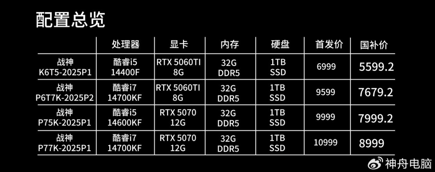 | 战神 P75K-2025P1 | 酷睿 i5-14600KF | RTX5070 12G | 32GB DDR5(官方未写频率) | 1TB SSD | - | 9999 元 |