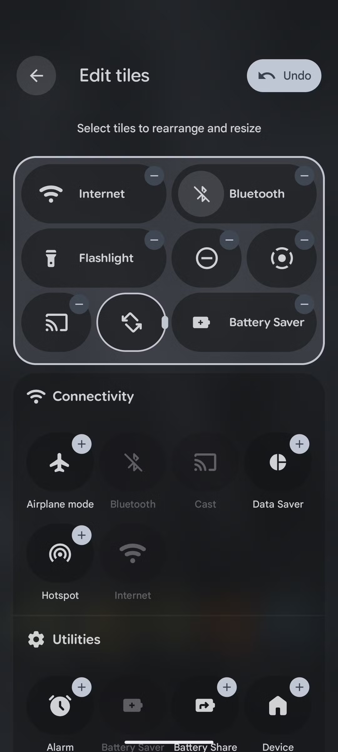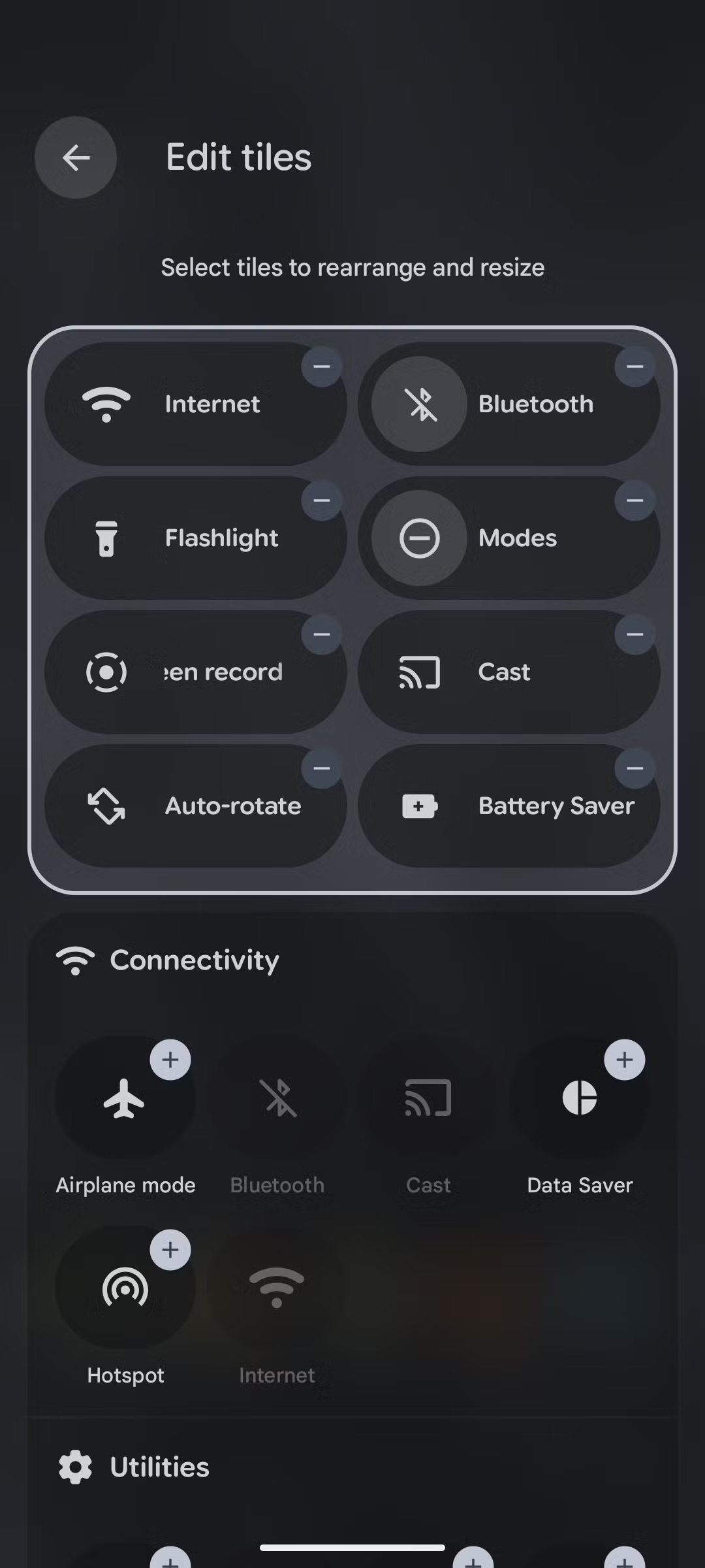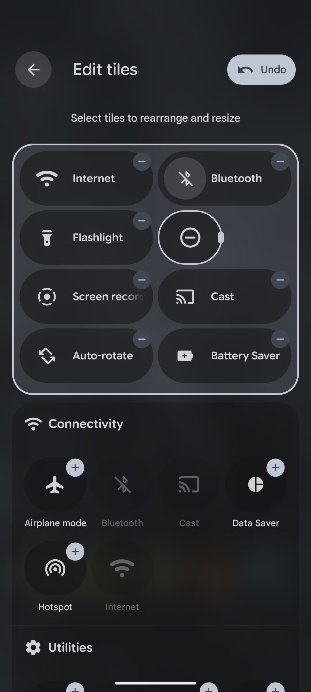 用户可以通过熟悉的编辑模式(点击铅笔图标)调整选项大小,点击任意快速设置选项后,即可显示可拖动的控件,将其从 2x1 调整为更小的 1x1 布局。IT之家附上截图如下: