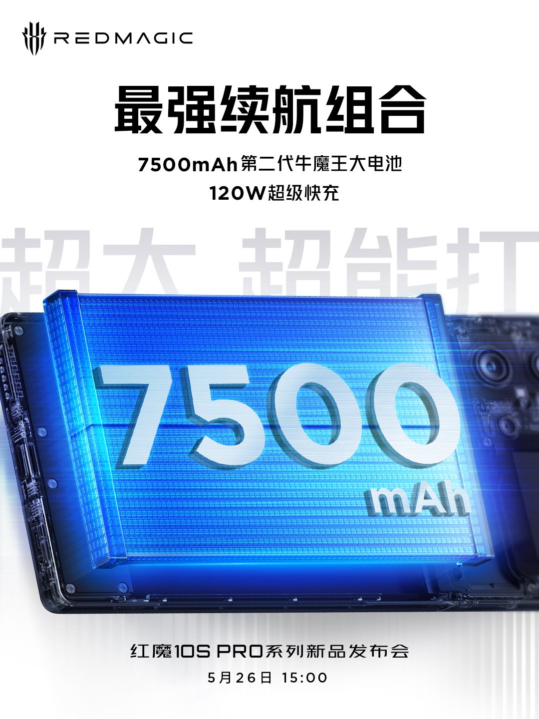 IT之家 5 月 21 日消息,红魔游戏手机官方今日预热持续 10S Pro 系列手机:新机配备 7500mAh 第二代牛魔王大电池,支持 120W 超级快充,号称“红魔史上最强续航组合”。