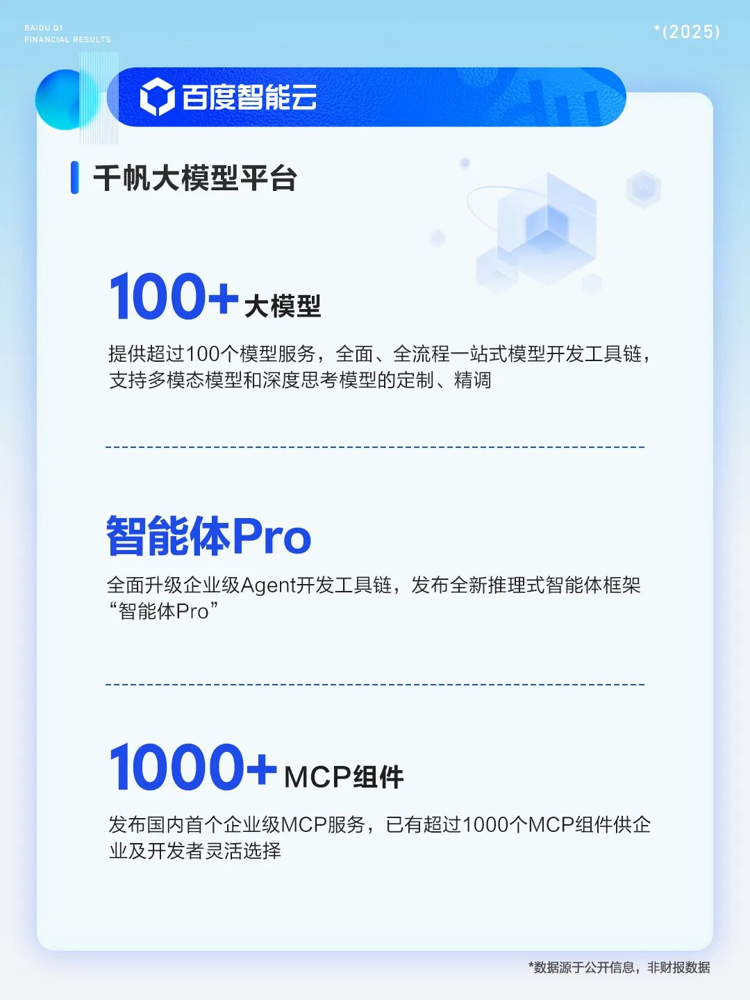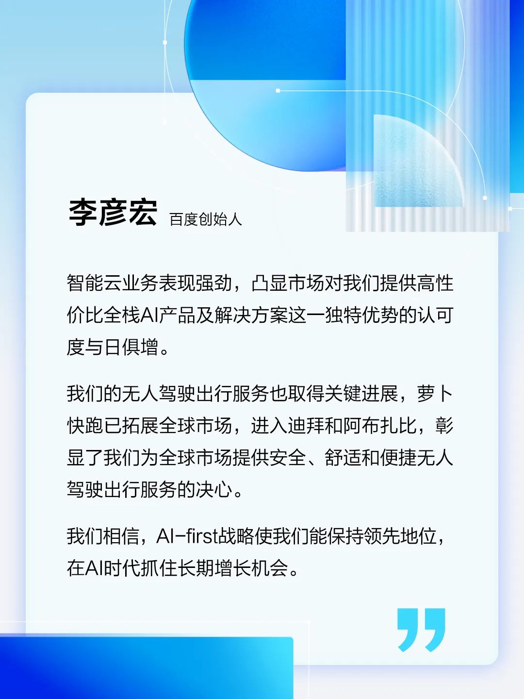 “智能云业务表现强劲,凸显市场对我们提供高性价比全栈 AI 产品及解决方案这一独特优势的认可度与日俱增。我们的无人驾驶出行服务也取得关键进展,萝卜快跑已拓展全球市场,进入迪拜和阿布扎比,彰显了我们为全球市场提供安全、舒适和便捷无人驾驶出行服务的决心。”百度创始人李彦宏表示,“我们相信,AI-first 战略使我们能保持领先地位,在 AI 时代抓住长期增长机会。”